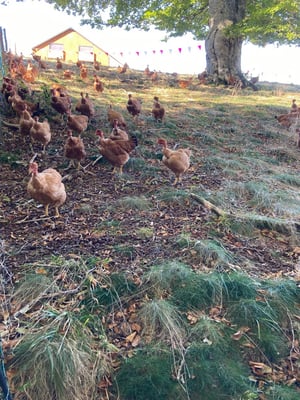 Poulets, : élevage de volailles Bio en plein air sur la montagne ardéchoise à Sagnes et Goudoulet à 1250 m d'altitude.